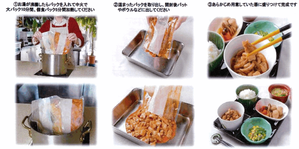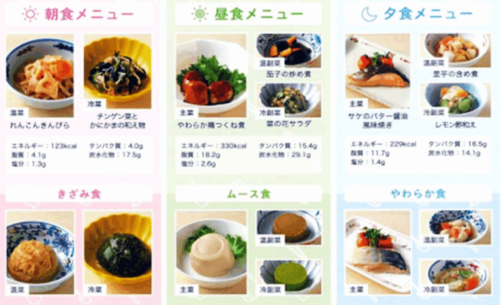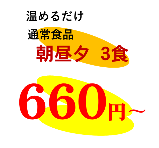 湯せん食品は、通常食、やわらか、ムース食の3種類を準備しています。通常食品は、朝昼夕3食で660円〜の低価格でご提供させていただいています。
