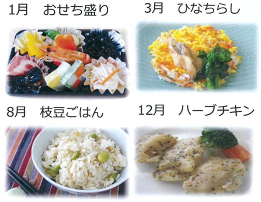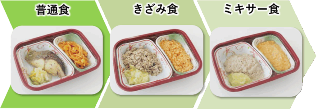 食事は、通常食、きざみ食、ミキサー食、ムース食に対応しています。